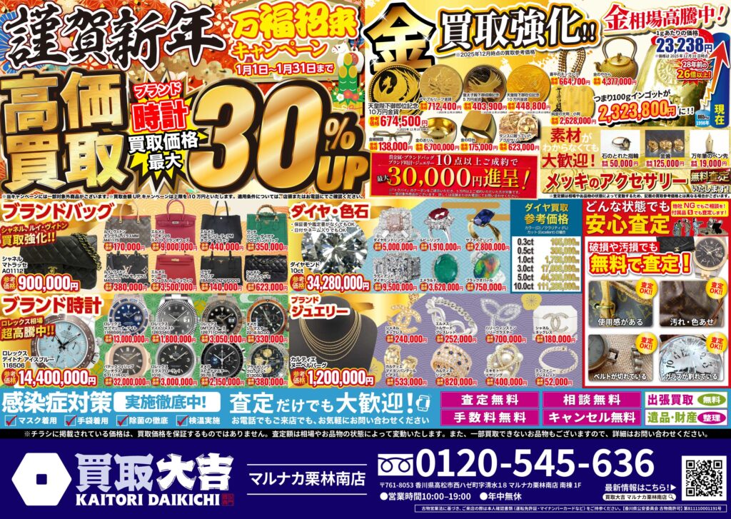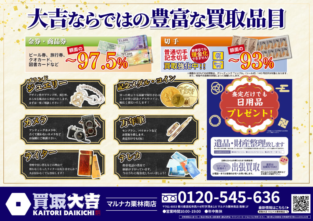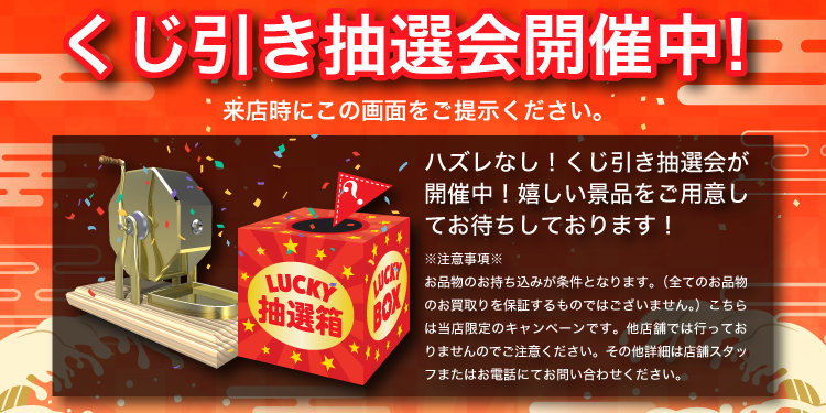 キャンペーン実施店舗 よくあるご質問 買取価格は主にどんな要素から決まるのでしょうか? お品物の状態や付属品の有無、最新相場、流通量などによって買取価格を算出します。 どんなものを買い取ってもらえますか? 金・貴金属・ブランド品はもちろん、お値段がつくか迷われているものも是非お持ちください。 傷や汚れのあるアイテムでも買取可能ですか? 大歓迎です。未使用品などのお持ち込みは少なく、傷や汚れのあるアイテムをお持ちいただく方が半数以上です。状態の悪いお品物やカビなどがあってもお買取可能なケースもございます。 どんな情報があればすぐに査定額を教えてもらえますか? お品物の名前や種類、状態、またはブランド名、型番などの情報があると、概ねの査定額をお伝えできるかと思います。 店舗での査定時間はどのくらいですか? お品物の種類や個数にもよりますが、約5分から30分ほどの査定時間となるケースが多いです。事前にある程度の査定時間をお伝えいたしますので、ご安心ください。